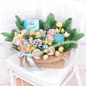 Искрящиеся снежинки - корзина с розовыми и кремовыми розами