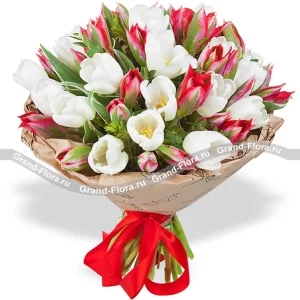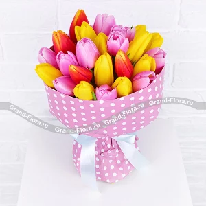 Всегда на высоте - букет из разноцветных тюльпанов с лентой