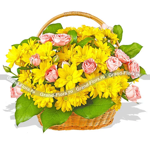 Стандартный (на фото): хризантема кустовая ромашковая - 9 шт., роза кустовая розовая - 3 шт., салал, оазис, корзина.