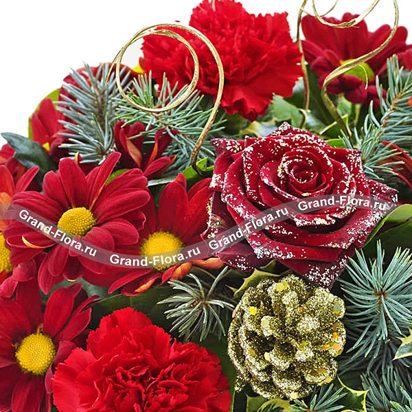 Стандартный: Роза красная - 3 шт., хризантема кустовая красная - 2 шт., гвоздика красная - 3 шт., салал - 2 шт., еловая ветвь - 3 шт., шишки декоративные (маленькие)- 2 шт., сизаль красный (упаковка), красная лента.