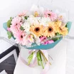 Стандартный: гербера розовая - 2 шт., гербера желтая - 1 шт., орхидея белая - 2 шт., тюльпан розовый - 3 шт., хризантема кустовая белая - 3 шт., декоративная зелень, упаковка, лента.